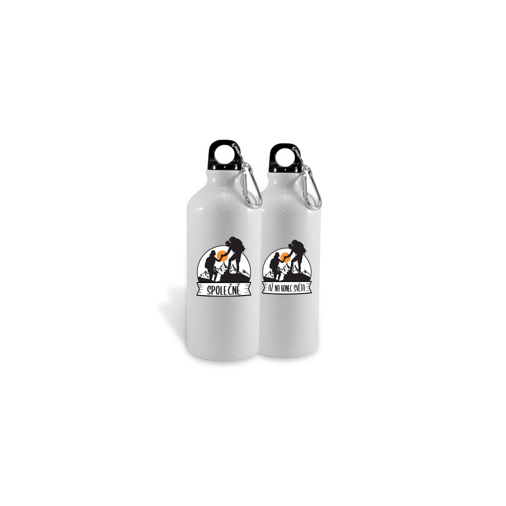 Turistické láhve s motivem Společně až na konec světa. Na hory jedině s pořádnou zásobou tekutin. Souhlasíte? S naši turistickými láhvemi s objemem 600 ml, které si lehce připevníte na příklad na batoh, nikdy nezapomenete pití doma. Tak co, jedna pro tebe a druhá pro tvého partnera?